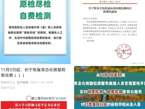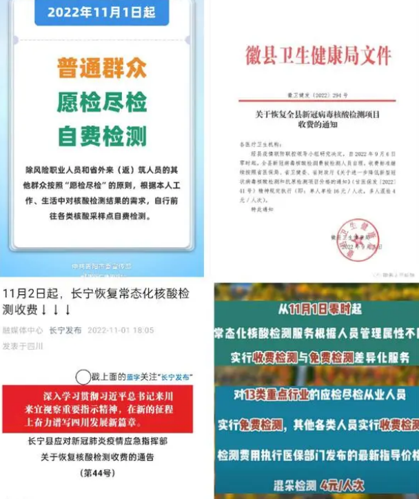2022年11月1日起,贵阳市常态化核酸检测有了新变化,除部分风险人员可进行免费核酸检测外,其他群众需按照“愿检尽检”原则,进行自费检测。