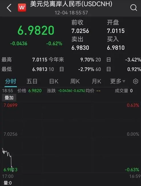 央广网北京12月5日消息 (记者 金龙)5日早盘,离岸人民币兑美元强势升破7.00关口,为9月份来首次,日内涨450点,最高报6.9665。