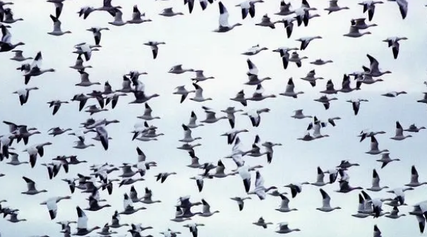 群鸟飞过湖面的动态描写
