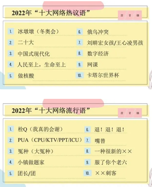 这一条其实是一组流行语,虽然字面有个“谢(栓)”,但实际上主要用来表达大无语状态或是非常厌烦的情绪,并非真的用来表示对他人的感谢。“栓Q”源于某抖音用户在2022年2月的一条宣传遇龙河竹筏漂流小视频的末尾所说的“Thank you.”,其中“thank”的发音酷似shuān。发音虽然不标准,但他说的“Thank you.”确实表达感谢。不过“栓Q”被创造出来后,含义、用法就大为不同了。“我真的会谢”来自某微博用户,创造伊始就用来表达吐槽而不是感谢。“栓Q”火起来之后,也被塞进了“我真的……”句式。一句“我真的栓Q”,无语程度直线上升。而“听我说谢谢你”又是另外一个故事了。它原本是一首儿童歌曲的歌名,也是该歌曲中的一句最高频歌词。作者的创作初心,是做一首专属于小朋友们的《感恩的心》。但随着歌曲的流行和魔幻新闻的不断冲击,“听我说谢谢你”越来越多地出现在了微博、公众号等的新媒体评论区——它很少被“屏蔽”,但也很难被“精选”。
