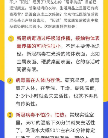 不少“阳过”经历了7天左右的“居家抗疫”目前已逐渐康复。感染期间的衣物、生活用品上是否还有病毒残留?是否会造成二次感染?北京地坛医院院感管理处处长卢联合表示,“阳过”居家康复后被家中物品感染的风险很小。这跟病毒特性相关: