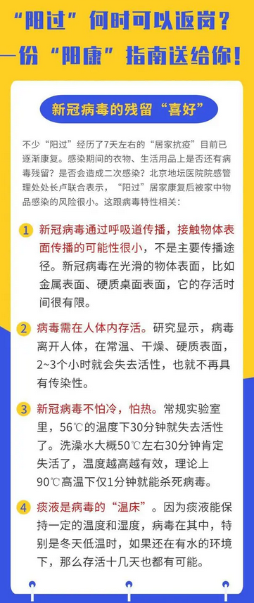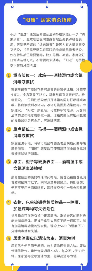 当下,各地复工复产已箭在弦上,这段日子,不少新冠病毒阳性感染者居家治疗后逐渐康复。但“阳过”们实在担心:家里的被子床单会不会藏匿病毒再次感染?“阳过”的家里该如何消杀才算“阳康”?何时返岗才不会造成新的感染?北京新闻广播记者专访了北京地坛医院院感管理处处长卢联合,北京佑安医院感染综合科主任医师、小汤山方舱医院医疗专家李侗曾。请收下这份“阳康”指南!