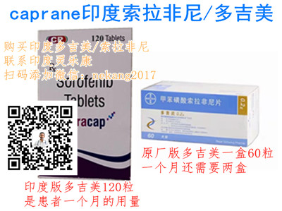 印度索拉非尼多少钱,印度索拉非尼是进口索拉非尼的仿制版,由印度卡布宁(caprane)公司仿制生产,目前在国内患者中得到了广泛使用。印度索拉非尼价格是1200元-2000元左右。印度索拉非尼不仅仅价格便宜,治疗效果还和原研版索拉非尼一模一样,对于想要购买印度索拉非尼(印度多吉美)的患者和家属可以添加印度灵乐康医疗联系微信: nekang2017 进行购买和了解。