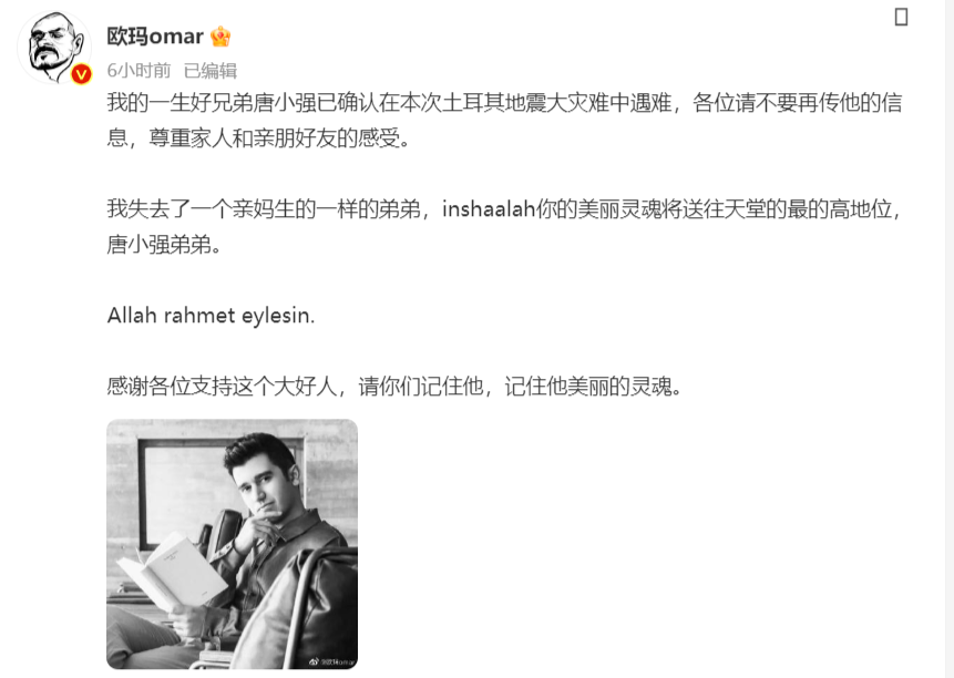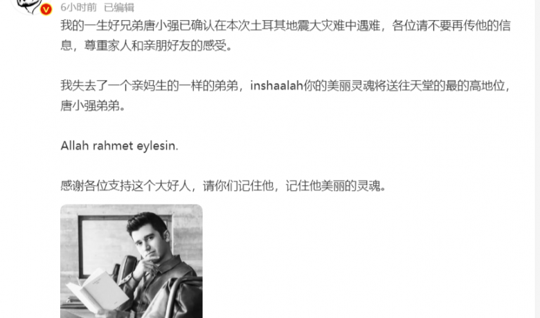 《非正式会谈》唐小强地震中不幸遇难 作者: xiaomidaifa 发布: 2023年2月10日 09:40:18 129阅读 10日,据土耳其媒体报道,《非正式会谈》唐小强已确认在地震中遇难,年仅30岁。 《非正式会谈》唐小强地震中遇难 2月10日,据“中国侨网”报道:据身在土耳其的@欧玛omar发布的最新消息称,唐小强已经确认在本次土耳其大地震中遇难 。 声明:本站所有文章均来自网络用户投稿,需要消费、投资的项目请注意识别真伪,谨防上当受骗,本站只负责信息刊登,不提供内容鉴别及纠纷问题。投稿内容若侵犯了您的权益请及时联系客服删除。