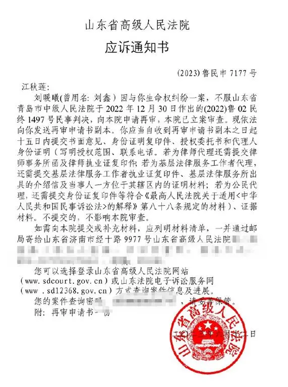 13日,江歌母亲江秋微博发文称,其收到山东省高级人民法院应诉通知书:刘暖曦(曾用名: 刘鑫)因与你生命权纠纷一案,不服山东省青岛市中级人民法院于2022年12月30日作出的(2022)鲁02民终1497号民事判决,向本院申请再审,本院已立案审查。2022年12月30日,江歌母亲江秋莲诉刘暖曦(原名刘鑫)生命纠纷权案二审宣判,刘暖曦被判赔偿江秋莲各项损失近70万元。