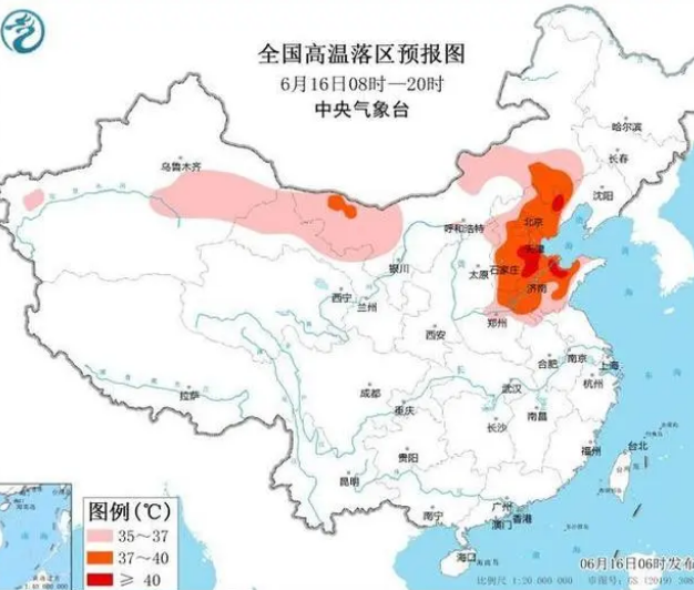预计6月16日白天,华北东部、黄淮中东部及辽宁西部、内蒙古东南部和西部、甘肃西部、新疆东部等地有35℃以上的高温天气,其中,京津冀大部、河南东北部、山东中北部及辽宁西部、内蒙古东南部等地最高气温37~40℃,局地可达40℃以上。