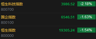大型科技股中,阿里巴巴-SW跌3.45%,腾讯控股跌2.4%,京东集团-SW跌3.34%,小米集团-W跌1.7%,网易-S跌2.62%,美团-W跌2.49%,快手-W跌1.94%,哔哩哔哩-W跌5.07%。