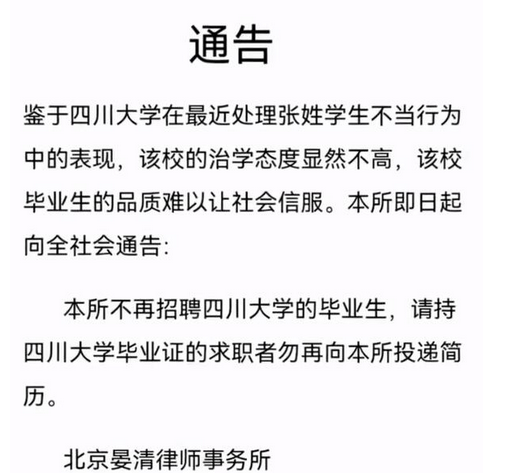 网友热议:北京一律所称不再招聘四川大学毕业生,称该校毕业生的品质难以让社会信服 作者: xiaomidaifa 发布: 2023年6月26日 08:28:30 155阅读 6月25日,北京。北京晏清律师事务所在其官方网站发通告称,鉴于四川大学在最近处理张姓学生不当行为中的表现,该校的治学态度显然不高,该校毕业生的品质难以让社会信服,律所不再招聘四川大学毕业生。 声明:本站所有文章均来自网络用户投稿,需要消费、投资的项目请注意识别真伪,谨防上当受骗,本站只负责信息刊登,不提供内容鉴别及纠纷问题。投稿内容若侵犯了您的权益请及时联系客服删除。