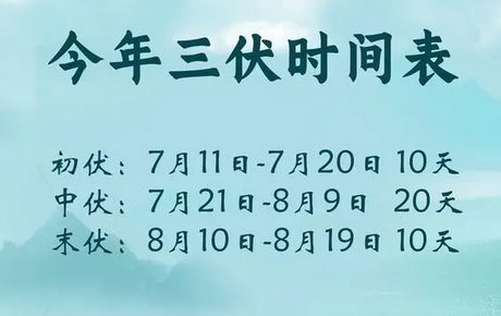 初伏持续的时间固定为10天,所以今年的初伏就是从7月11日至7月20日;末伏,是立秋之后第一个庚日。今年立秋是8月8日,往后找到的第一个庚日(庚子日)是8月10日,这一天就是末伏的第一天。末伏持续的时间也固定为10天,所以今年的末伏就是从8月10日至8月19日。