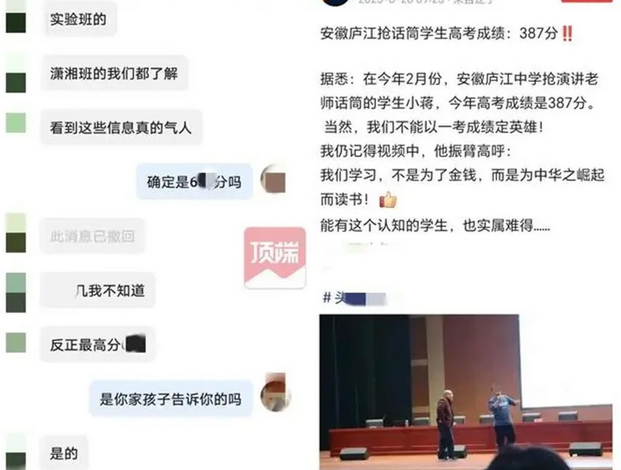 6月26日,有网友发文称今年2月安徽省庐江某中学上台抢演讲教授话筒学生高考失利,成绩为387分,引发关注。27日,学校高三一位毕业生告诉顶端新闻记者,网上所传内容不实。(据6月27日顶端新闻)