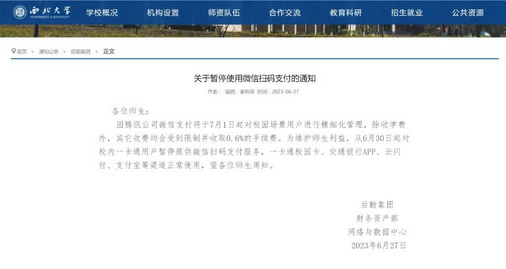 西北大学发布的公告称,“因腾讯公司微信支付将于 7 月 1 日起对校园场景用户进行精细化管理,除收学费外,其它收费均会受到限制并收取 0.6% 的手续费。为维护师生利益,从 6 月 30 日起对校内一卡通用户暂停提供微信扫码支付服务,一卡通校园卡、交通银行 App、云闪付、支付宝等渠道正常使用,望各位师生周知。”