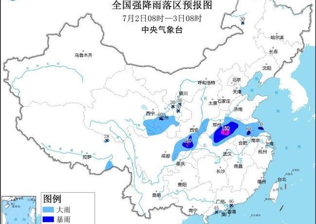 中央气象台7月2日06时继续发布暴雨蓝色预警:预计,7月2日08时至3日08时,四川东部和北部、重庆西部和北部、陕西东南部、河南西部和中南部、湖北北部、安徽中北部、江苏中部、山东西南部以及青海东部、甘肃东南部、西藏北部和东南部、广东南部沿海、内蒙古东部等地部分地区有大到暴雨,其中,河南中南部、安徽西北部、四川东北部等地部分地区有大暴雨(100~160毫米);上述部分地区伴有短时强降水(最大小时降雨量20~50毫米,局地可超过60毫米),局地有雷暴大风等强对流天气。