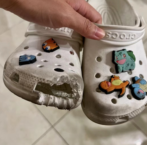 在社交媒体平台,有网友分享了家人穿洞洞鞋乘扶梯时的“惊险一幕”,称乘扶梯时低头没注意,没有及时迈出去,电梯把洞洞鞋夹进去了。万幸的是,没有夹到脚趾,但据图片来看,鞋头已经被夹烂了。记者查询后发现,也曾有媒体报道,有3岁儿童穿洞洞鞋坐扶梯时,洞洞鞋被卷入电梯,脚趾严重受伤。