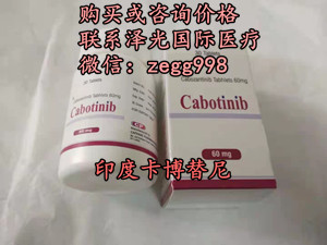 印度卡博替尼的价格也比价实惠,印度卡博替尼规格60mg30片一盒约2200元左右;20mg30片一盒1200元左右。由于汇率的波动价格也会变动,但是幅度不会很大,实时价格咨询。正版价格让人难以接受,所以很多人问关于代购印度卡博替尼代购的事情,患者可以亲自出国购买,一般家庭购买药品比较麻烦。不能出国的患者可以选择海外医疗机构代购,例如,泽光国际医疗机构:zegg998,印度直邮,渠道正规!