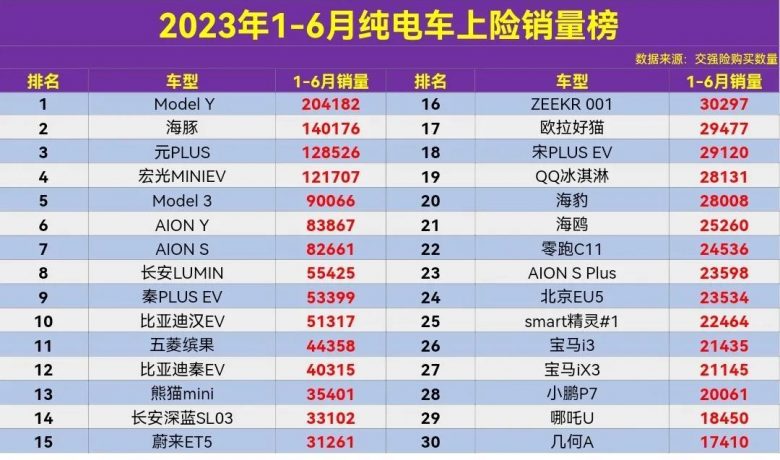 2023年新能源纯电车销量榜(上半年),Model 3第5,秦PLUS第10,海豹第20名