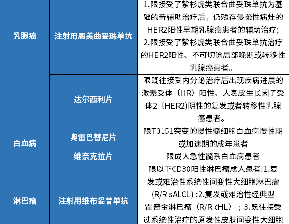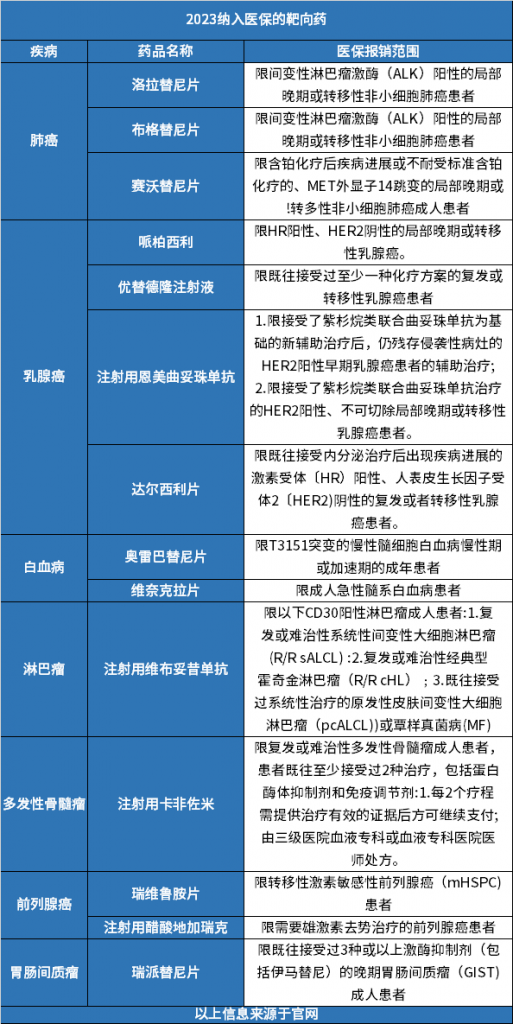 2023年进入医保的抗癌药物共有14个,其中非小细胞肺癌3个,洛拉替尼,布格替尼,赛沃替尼;乳腺癌4个,哌柏西利,恩美曲妥珠单抗,达尔西利,优替德隆;前列腺癌2个,瑞维鲁胺,地加瑞克;胃肠道间质瘤1个,瑞派替尼;血液肿瘤4个,维奈克拉,奥雷巴替尼,维布妥昔单抗,卡非佐米。通常纳入医保的靶向药,通常属于乙类药品,可以报销60%以上。如下图所示