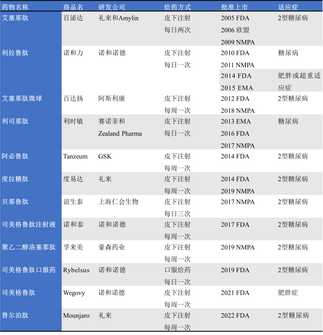 最新消息,全球唯一一种借助于SNAC促溶剂制成的口服索马鲁肽(Rybelsus)获批上市。前全球有多款GLP-1RA被批准上市,在国内上市的GLP-1RA就达到8款,包括短效/速效制剂贝那鲁肽、艾塞那肽和利司那肽以及长效制剂利拉鲁肽、艾塞那肽微球、度拉糖肽、聚乙二醇洛塞那肽和司美格鲁肽