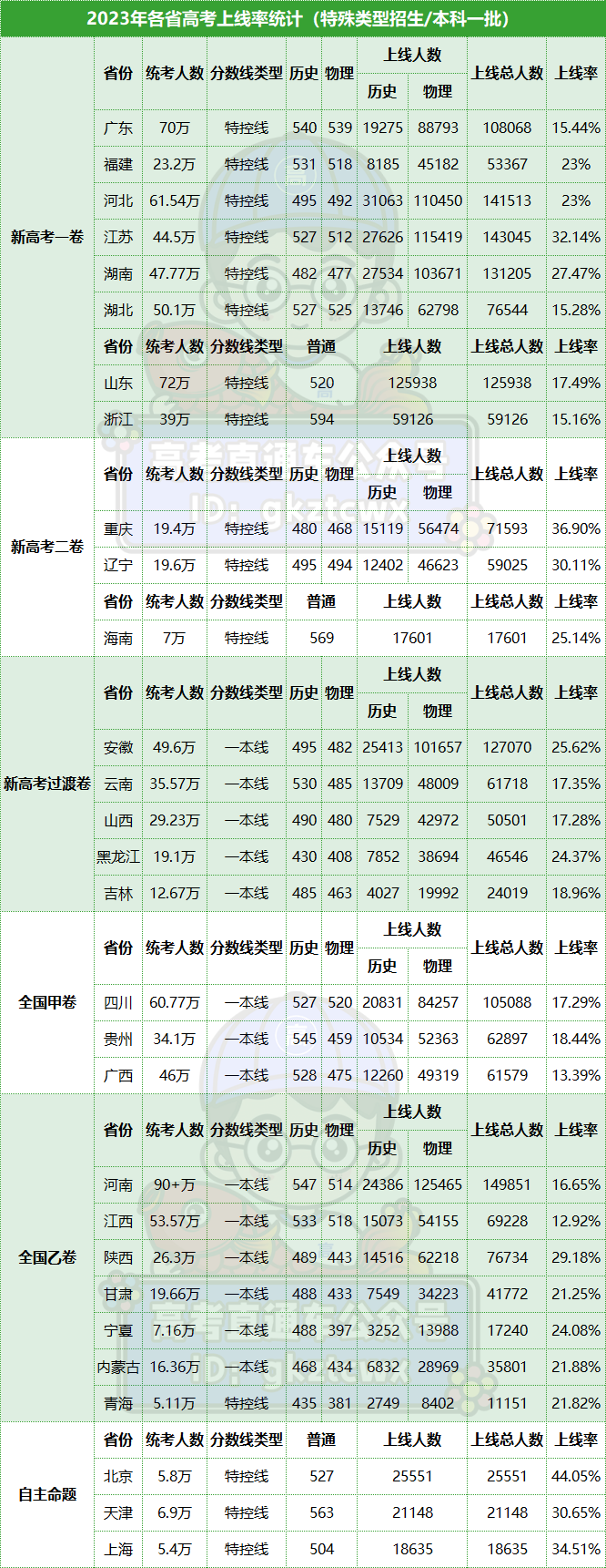 2023年各省高考上线率统计(特殊类型招生/本科一批)