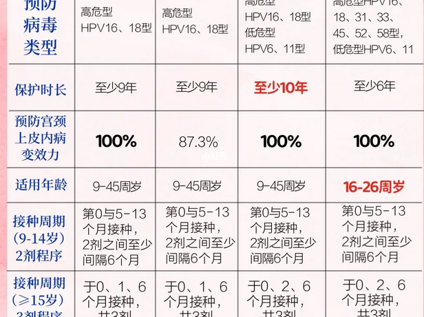 区别二、预防范围不同。二价HPV疫苗预防范围比较小,主要预防HPV16、18型的病毒,四价HPV疫苗可以预防HPV16、18、6、11型的病毒,九价HPV疫苗在四价HPV疫苗的基础上还可以预防HPV31、33、45、52、58等病毒。