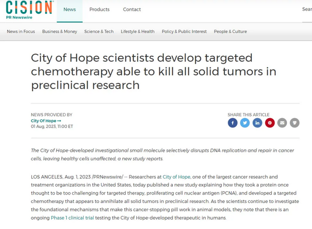 美国顶级癌症治疗和研究机构希望城市(City of Hope)国家医疗中心周二发布公告称,在临床前研究中,该机构科学家开发出一种能杀死所有实体恶性肿瘤(癌瘤)的靶向化疗药物AOH1996