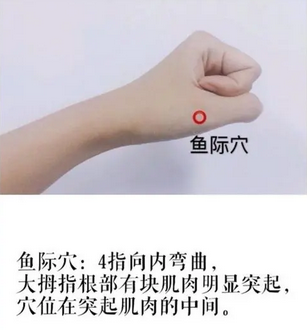第一个,鱼际穴。中点处鱼际穴,然后我们去推,用手的拇指推30-50次。
