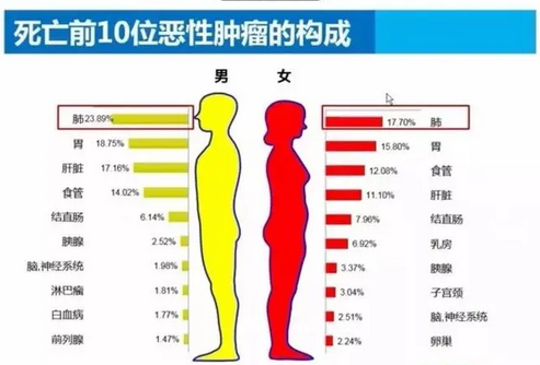 第二就是肺癌。肺癌的发病率和死亡率也都很高,吸烟和肺癌的关系极为密切。所以一定要避免吸烟,避免吸二手烟。