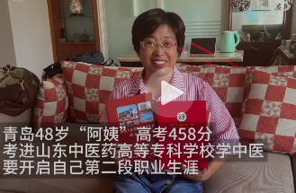 家在青岛的王阿姨以48岁的年龄再次参加夏季高考,高考成绩458分,高出山东一段线15分并被山东中医药高等专科学校录取,准备开始自己的第二段大学生活。