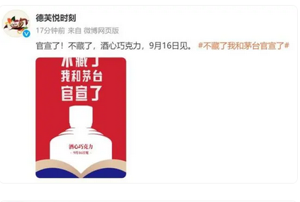 9月14日10时00分,德芙和贵州茅台同时在微博宣布,双方合作的酒心巧克力将于9月16日上市。13日晚,贵州茅台官微发布了一张意味深长的海报,海报上写着“入口即化、回味悠长”“贵州茅台×?”“9月16日,敬请期待”,暗示继酱香拿铁之后,茅台将于9月16日再推联名新品。
