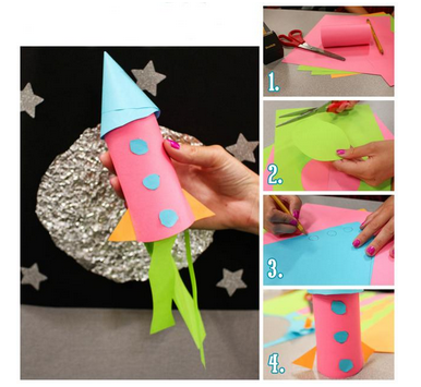 步骤四、最后剪一些纸条,粘在纸筒底部内侧,飞往太空的火箭做好啦!