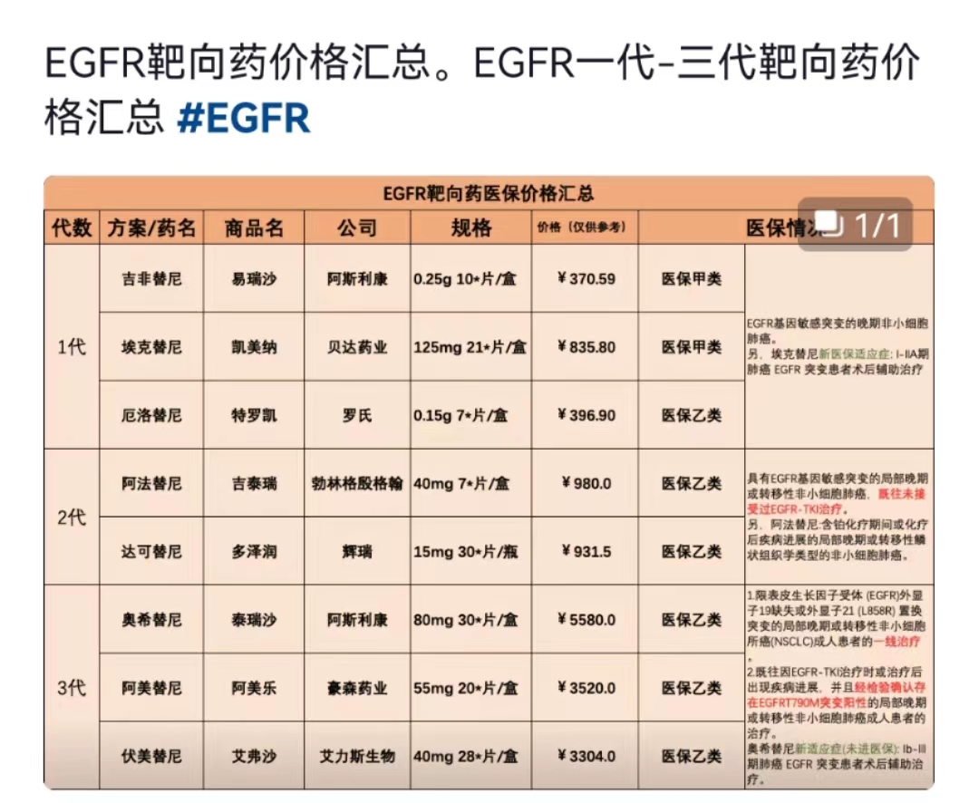 1代靶向药针对具有EGFR基因敏感实变的晚期非小细胞肺癌。另,埃克替尼新医保适应症:I-AN肺瘤EGFR突交患省术后辅助治疗