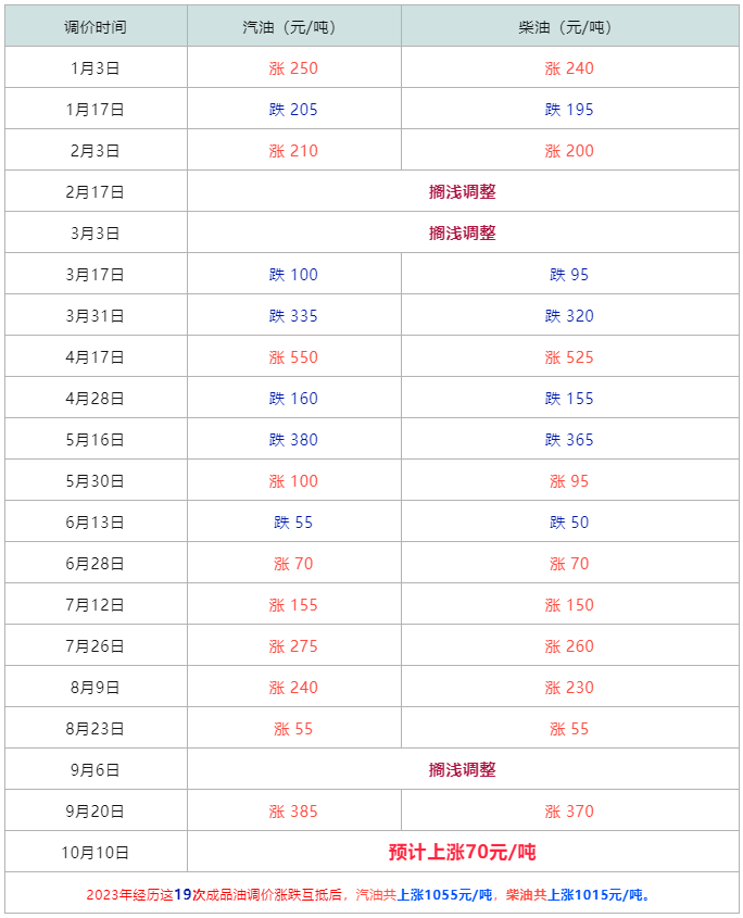 2023年油价涨跌明细表一览