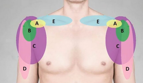 A. 滑囊炎(肩关节周围的滑囊炎症) ;B. Slap 损伤(肩关节窝上的软骨环受损); C1. 肩周炎(关节囊发炎,变硬变厚); C2. 肩袖损伤(肩袖肌腱劳损/撕裂); D1. 肌腱炎(二头肌劳损/撕裂导致炎症) ;D2. 肩峰撞击(肩峰下空隙减小,肌腱发炎);E. 锁骨损伤 (锁骨骨折)。