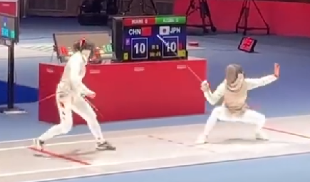 亚运会女子个人花剑1/4决赛,中国队的黄芊芊11:10绝杀战胜日本队的東晟良,完成绝杀的黄芊芊激动的跪地怒吼!
