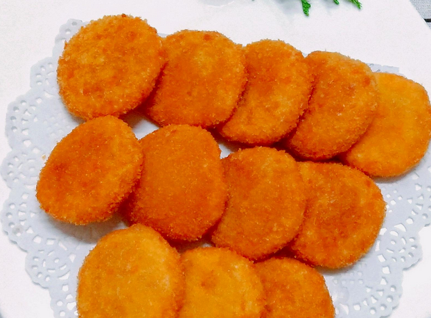 南瓜饼很多人在家里都做不好,我说哪有那么难嘛,不信你就看看我这个做法和烧开水一样简单,首先你只需要把老南瓜切成厚一点的薄片,上锅蒸熟,蒸出来的水不用倒,再用勺子压成泥,加一勺白色的糖,两勺糯米粉,揉成不沾手的面团,揪一块按压成饼,先沾一遍清水,再裹上面包糠,裹成我这个样子。六成油温下锅炸,看都看到这了,能否帮皮皮点个小红细鼓粒,谢谢啦,炸到鼓起八面金黄就可以出锅啦。这样做的南瓜饼外酥里糯,孩子们一口一个。