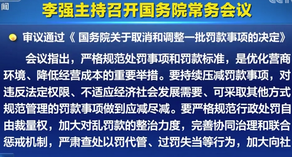 国务院总理李强主持召开国务院常务会议,审议通过《国务院关于取消和调整一批罚款事项的决定》。