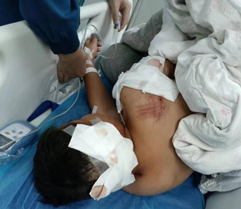 湖南省邵阳市城步县丹口镇10岁男童轩轩被狗咬伤后,在ICU病房内抢救。