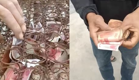 广西梧州一村民在收废品的时候,无意间收到一张旧床垫,他和往常一样,拆开床垫外面的布料,发现在床垫内部的弹簧间隙里,有很多现金,币值不等,塞得到处都是。