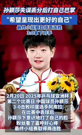 在近日的一场国际乒乓球比赛中,国乒小将孙颖莎在比赛中因失误而“打了自己一巴掌”,这一举动迅速引发了网友的热议。许多网友表示,孙颖莎的自我激励方式虽然有些“狠”,但也体现了她对自己高要求的态度。