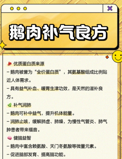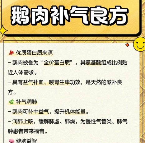 鹅肉还具有温中益气、补肾壮阳的功效。中医认为,鹅肉性平味甘,适合体质虚弱、气血不足的人群食用。对于经常感到疲劳、四肢无力的人来说,适量食用鹅肉可以起到很好的滋补作用。