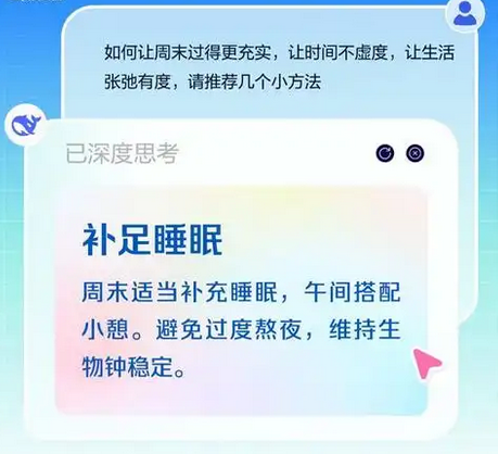 专家表示,合理利用周末时间不仅有助于提升个人能力和生活质量,还能为下一周的工作和生活注入更多动力。DeepSeek的这份指南无疑为现代人提供了一份实用的“周末生活手册”。