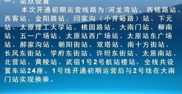太原地铁1号线全长约23公里,共设车站23座,贯穿城市南北,连接了多个重要商圈和交通枢纽。开通首日,许多市民早早来到车站,体验这一全新的交通工具。一位市民表示:“地铁的开通真是太方便了,以后上班再也不用担心堵车了。”