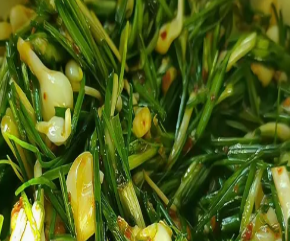 - 最后加入野蒜段,快速翻炒至断生即可出锅。