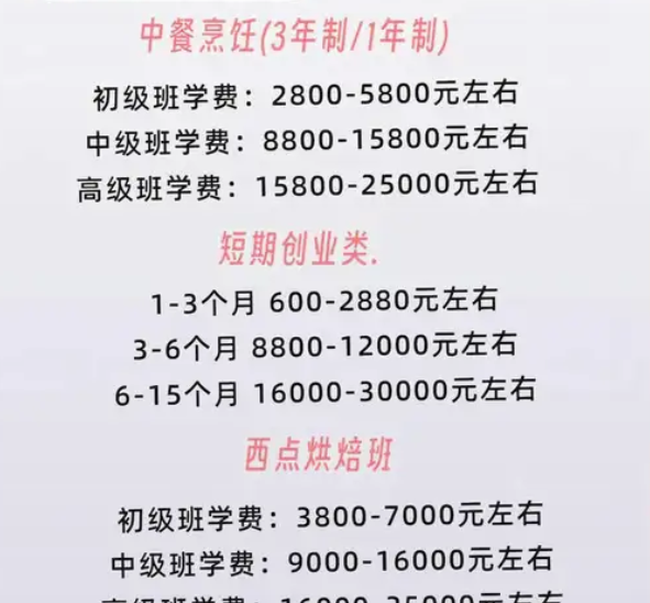 此外,学费还包括教学费用、实训费用、教材和学习资料费用,但不包含住宿和伙食费。以中餐厨师班为例,小吃速成班学费为2800元—5800元左右;短期烹饪精修班学费为6800—16800元左右;长学制班学费为16800—29800元左右。西点烘焙班中,烘焙兴趣班学费为3200元—6500元左右;西点创业班学费为8000—17000元左右;长学制班学费为17400—30000元左右。中式面点班里,面点兴趣班学费为2400元—4000元左右;面点精修班学费为4800—8800元左右;面点高级班学费为10800—20000元左右。
