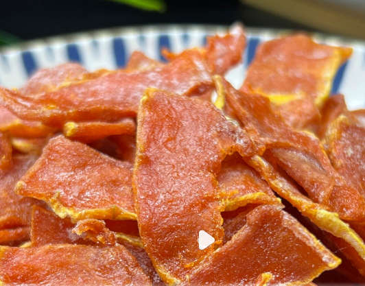 上浆是南瓜干的关键步骤,将芡粉与水按比例调成糊状,均匀涂抹在南瓜片上,再次暴晒或烘烤至表面不粘手。可根据口味添加芝麻、白糖、桔皮等配料,提升风味。包装时需用食品级塑料袋或塑料盒密封,避免受潮。制作完成的南瓜干呈金黄色半透明状,入口甜香有嚼劲,无论是作为零食还是伴手礼,都充满自然风味。