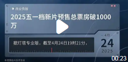 据灯塔专业版数据,截至4月24日19时21分,2025年五一档新片预售总票房突破1000万元。其中,女性励志题材《水饺皇后》以320万元领跑,犯罪悬疑片《猎金·游戏》、喜剧《人生开门红》紧随其后。