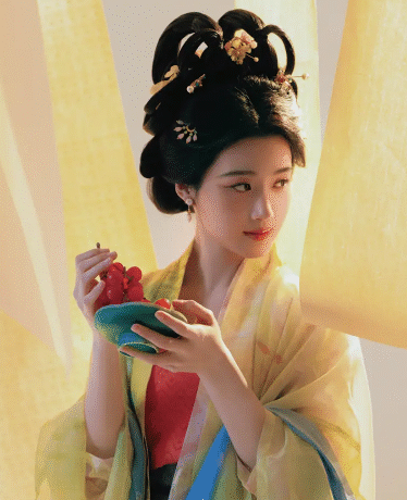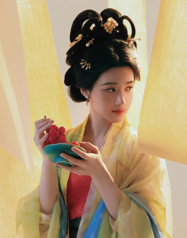 卢昱晓身着的鹅黄襦裙色彩柔和,款式古朴,完美展现了古代女子的温婉与柔美。裙身绣有精美的花卉图案,随着她的步伐轻轻摇曳,仿佛将观众带入了那个充满诗意的古代世界。发型上,她选择了古典的盘发造型,搭配上精致的发饰,更添了几分古典韵味。妆容方面,卢昱晓以清透自然的底妆为主,搭配上淡淡的眼妆和唇色,营造出一种清新脱俗的感觉。
