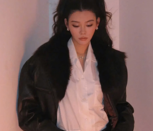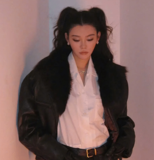 照片中,奚梦瑶身着一件设计感十足的皮衣,这件皮衣在保留了皮衣经典质感的同时,加入了不对称剪裁、流苏装饰等时尚元素,既保留了皮衣的酷帅风格,又不失女性的柔美与灵动。搭配上简约的白色T恤和高腰牛仔裤,整体造型既复古又摩登,完美诠释了“简约而不简单”的时尚理念。