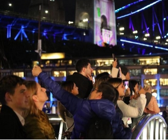 当地时间5月23日晚,澳大利亚悉尼,2025“缤纷悉尼(Vivid Sydney)”灯光音乐节开幕。图为悉尼海港大桥前拍照“打卡”的游人。