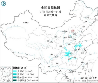 预计,6日早晨至上午,河北中部、江苏中部、安徽北部、湖北中部、湖南北部、江西中部等地的部分地区有大雾天气,其中,安徽北部、湖北中部、湖南北部、江西中部等地的部分地区有能见度不足500米的浓雾,局地有能见度不足200米的强浓雾,中央气象台3月6日06时继续发布大雾黄色预警。