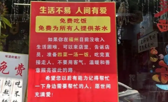近日,有网友分享了福州味滋初餐厅免费为经济困难的人群提供免费的餐食,店门口贴出告示。